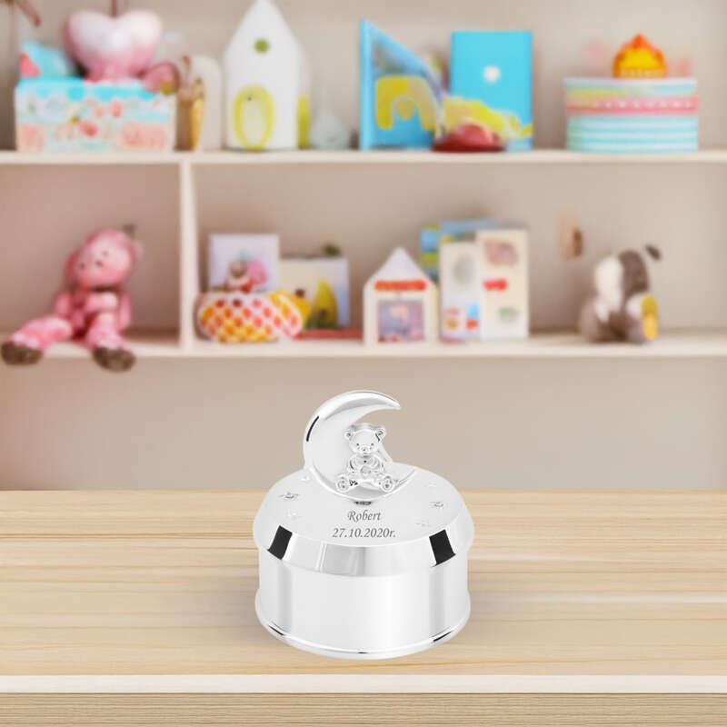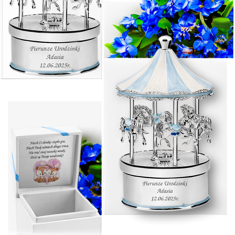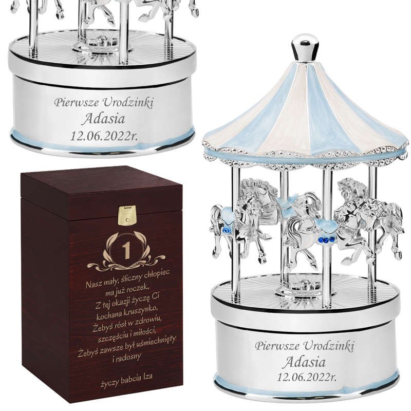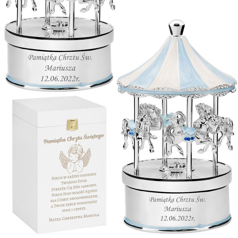 Efektowne pozytywki z personalizowanym grawerem - Dźwięk oraz widok pozytywki przywodzi na myśl czas dzieciństwa i bajecznej beztroski. Pozytywki faktycznie potrafią pozytywnie nastrajać użytkowników, gdyż prezentują się okazale i cieszą ucho znakomitymi dźwiękami. Pozytywki z oferty naszego sklepu mają jeszcze jedną, niezwykle istotną, zaletę – mogą być personalizowane według życzeń nabywcy. Każdą z pozytywek można ozdobić pamiątkowym grawerunkiem, dedykacją, cytatem i symbolami graficznymi. Grawerowanie to trwała technika ozdabiania przedmiotów, a usługa ta jest wliczona w cenę produktu. W asortymencie naszego sklepu można znaleźć pozytywki na każdą okazję: chrzciny, urodziny, dzień dziecka, imieniny. Oferujemy pozytywki z kryształkami Swarovskiego, pozytywki ze szkatułką, pozytywki z miejscami na zdjęcia, a także pozytywki pozłacane i posrebrzane. W naszym asortymencie nie brak pozytywek z motywami religijnymi, które idealnie nadają się na prezent na chrzciny, jak również pozytywek o uniwersalnej i ponadczasowej estetyce dziecięcej – w kształcie karuzeli lub z baletnicą. Każda z nich jest równie wysokiej jakości, co jest gwarancją ich trwałości i prawidłowego działania. Ekskluzywne wykończenie, kryształki, pozłacane lub posrebrzane elementy to detale, które sprawiają, że pozytywki z naszego sklepu będą wspaniałą ozdobą wnętrz domowych i świetną pamiątką na przyszłość.