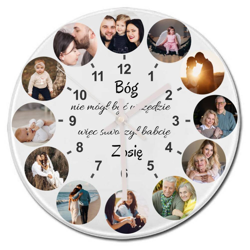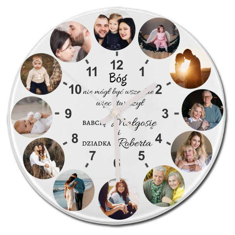 Prezent dla Babci: szklany zegar z 12 zdjęciami i własnym tekstem