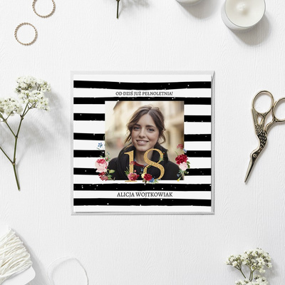 Kartka na urodziny - czarno - białe paski 18 urodziny