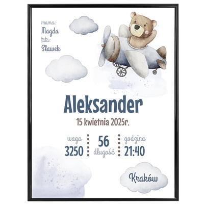 Plakat Metryczka / Prezent na Narodziny dla Chłopca / Miś / Prezent na Baby Shower / plexi
