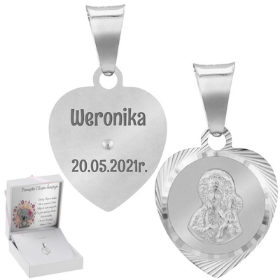 Srebrny medalik serce Matka Boska pr. 925 Grawer Chrzest Komunia