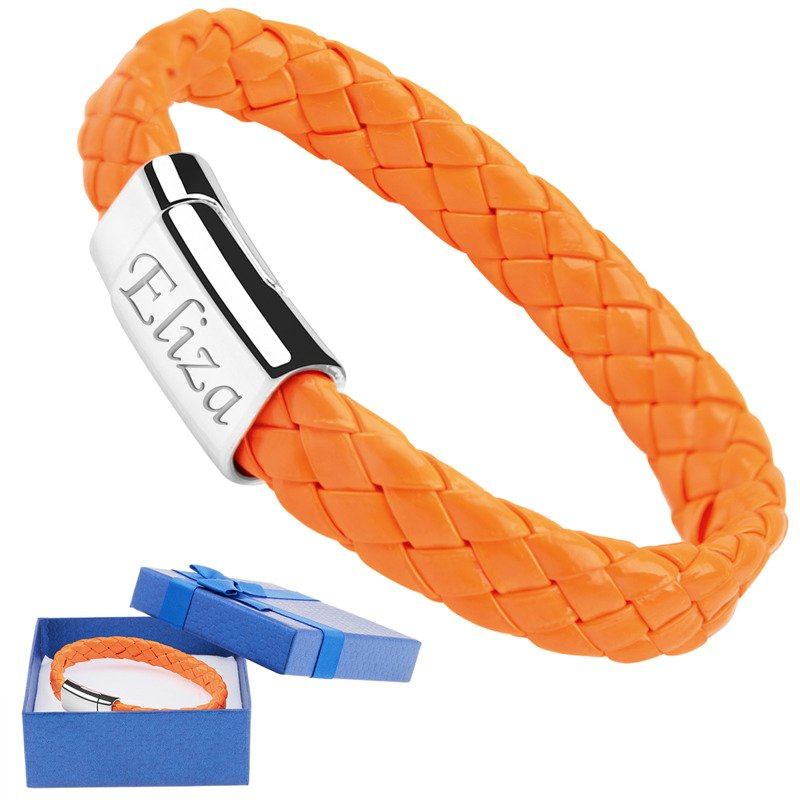 Pomarańczowa neonowa bransoletka stal 316L eko skóra z grawerem