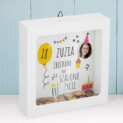 Drewniana skarbonka ze zdjęciem dziecka z Nadrukiem
