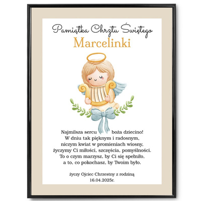 Plakat na Chrzest / Personalizowany / Pamiątka Chrztu z dedykacją / Ramka ze szkłem / Aniołek