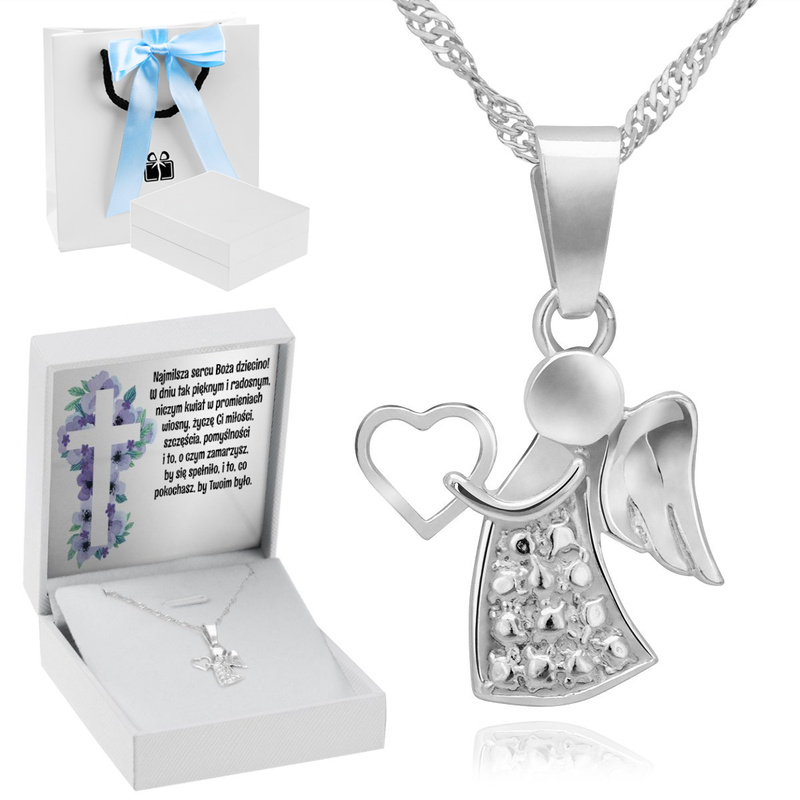 Chrzest i Roczek: srebrna zawieszka aniołek z łańcuszkiem i dedykacją