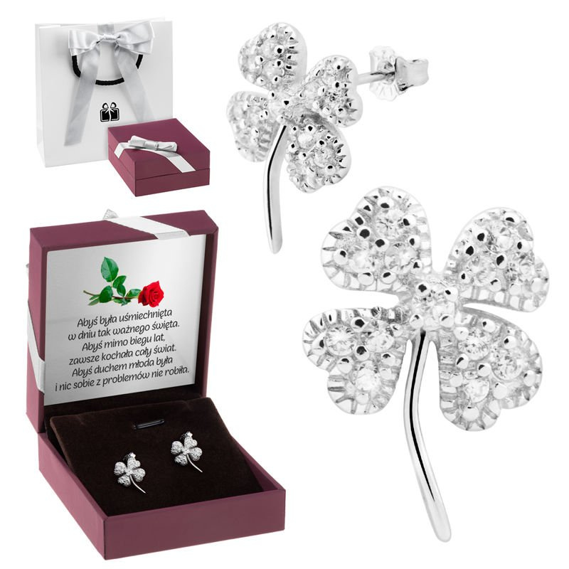 Srebrne Kolczyki Koniczynki zdobione cyrkoniami pr. 925 Prezent z Dedykacją