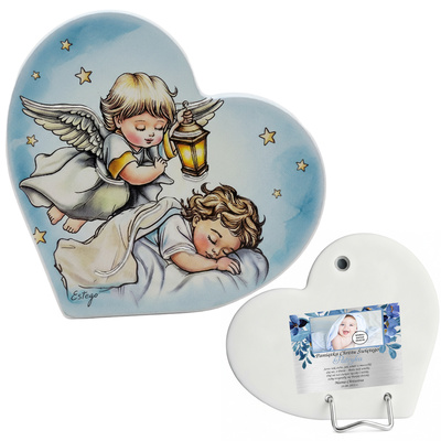 Obrazek Aniołka malowany na drewnie 11x10 cm – Estego, srebrne ręczne zdobienie, pamiątka na Chrzest dla chłopca