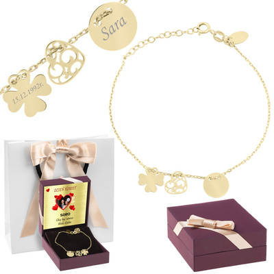 Pozłacana bransoletka pr.925 koniczynka serce kółko z grawerem