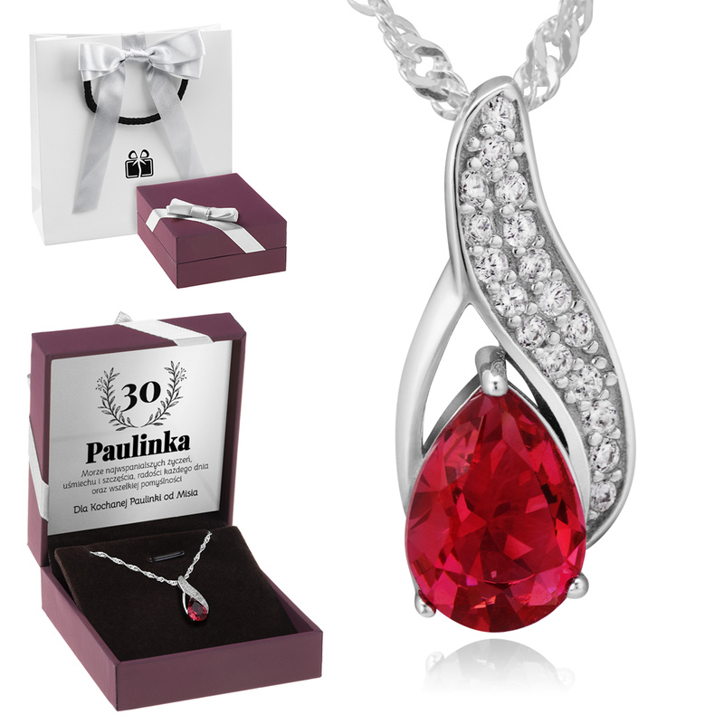 Naszyjnik z rubinową cyrkonią – srebrny łańcuszek Singapur Dedykacja