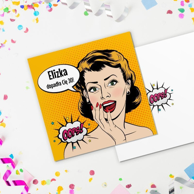 Kartka urodzinowa pop-art z imieniem, wiekiem i życzeniami