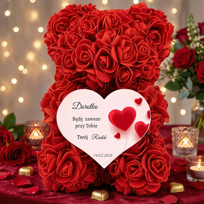 Miś z czerwonych róż z sercem – personalizowany prezent na Walentynki