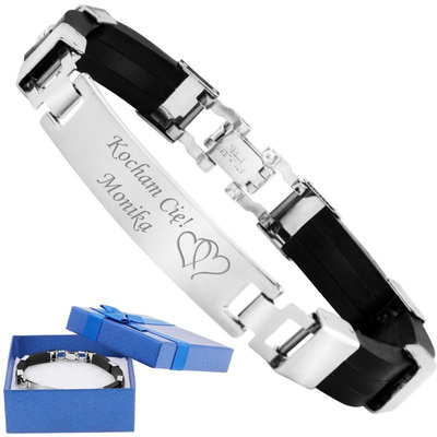 Bransoletka męska 316L i kauczuk, czarna, z grawerem w pudełku