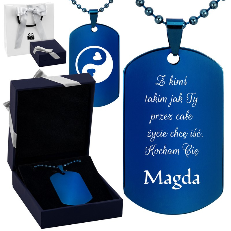Nieśmiertelnik niebieski stal szlachetna z grawerem i dedykacją