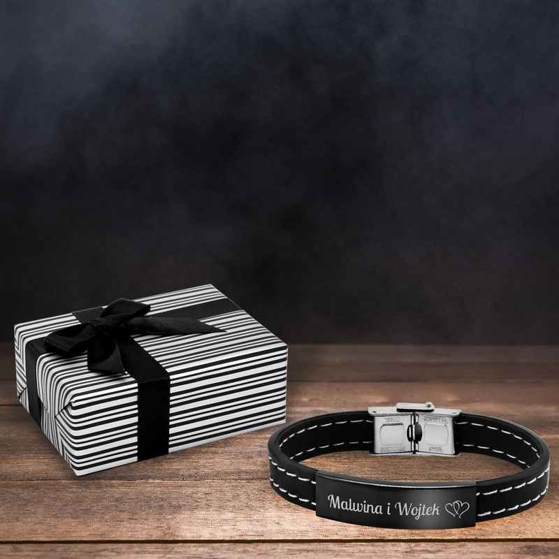 Bransoletka z kauczuku i czarnej stali szlachetnej z Grawerem / prezent dla męża, brata, chłopaka / pakowanie na prezent - paski
