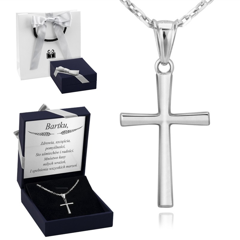 Srebrny krzyżyk z łańcuszkiem / na I Komunię Św. / Chrzest Św. / pr. 925 / Dedykacja w pudełku