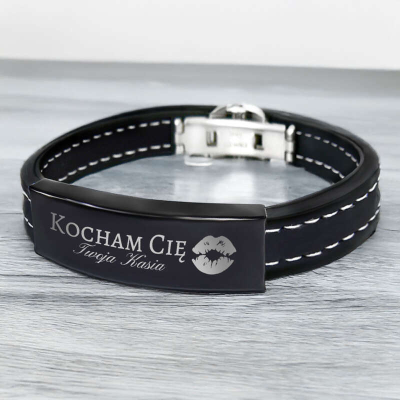 Bransoletka męska 316L i kauczuk, czarna, z grawerem w pudełku