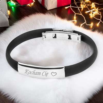 Srebrna bransoletka kauczukowa z grawerem na stalowym elemencie