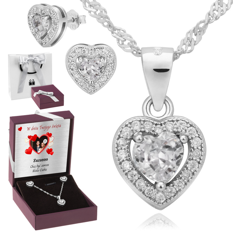 Srebrny komplet wisiorek i kolczyki pr 925 serce z białą cyrkonią Dedykacja