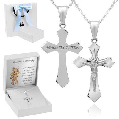 Srebrny 925 Krzyżyk z Jezusem Chrzest Komunia Bierzmowanie Grawer