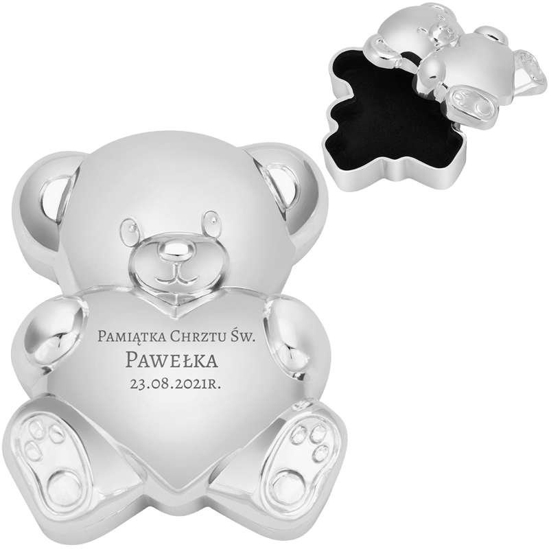 Szkatułka z misiem na ząbek posrebrzana z Grawerem na Chrzest Roczek
