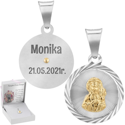Srebrny medalik z Matką Boską, pozłacaną Dedykacja