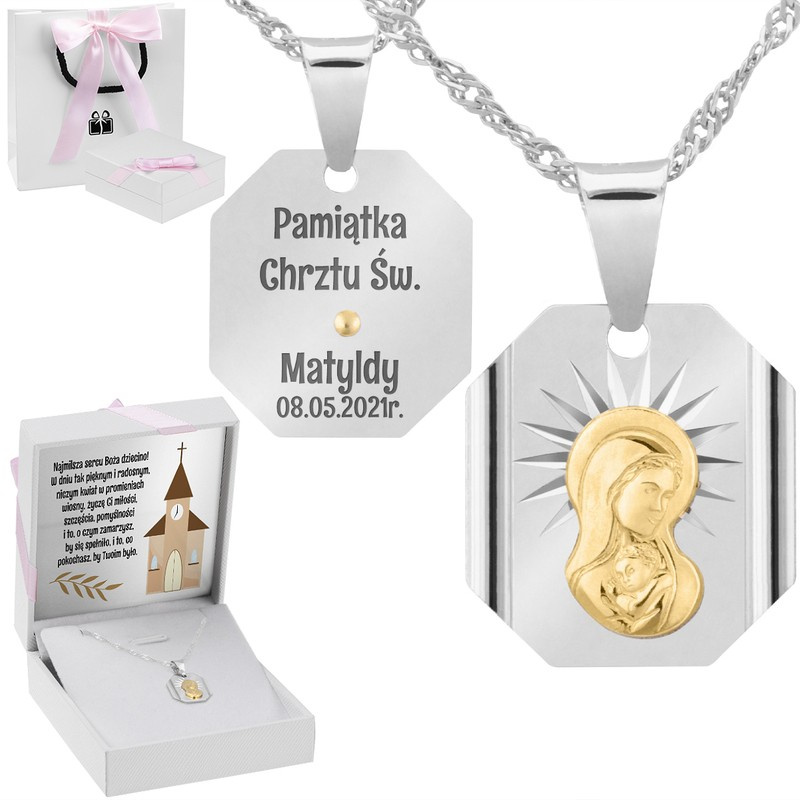 Srebrny medalik z Matką Boską, pozłacaną Dedykacja