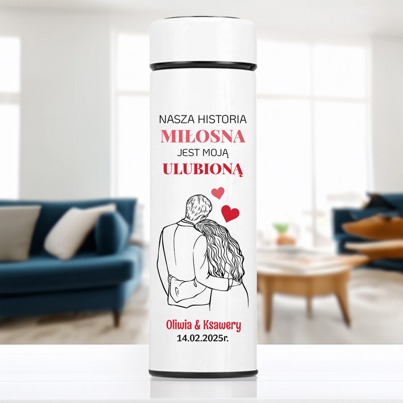 Kubek termiczny z wyświetlaczem LED i personalizowanym nadrukiem UV – Nasza historia miłosna