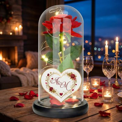 Wieczna róża w szkle z LED i personalizacją – romantyczny prezent z inicjałami