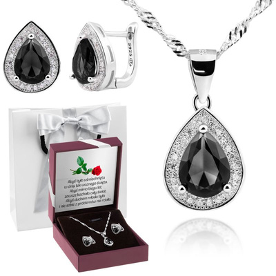 Srebrny urzekający komplet pr. 925 cyrkonia - czarna łezka Prezent z Dedykacją