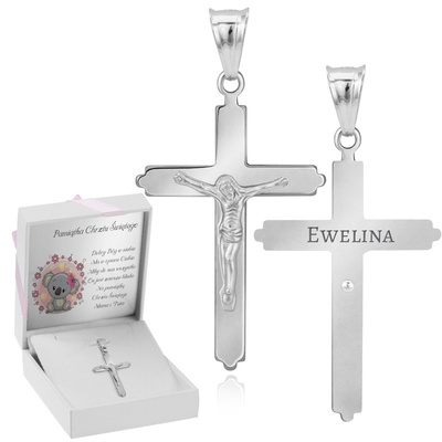 Srebrny duży krzyżyk z Jezusem z łańcuszkiem / na I Komunię Św. / Chrzest Św. / pr. 925 / różowa kokardka / z Grawerem i Dedykacją
