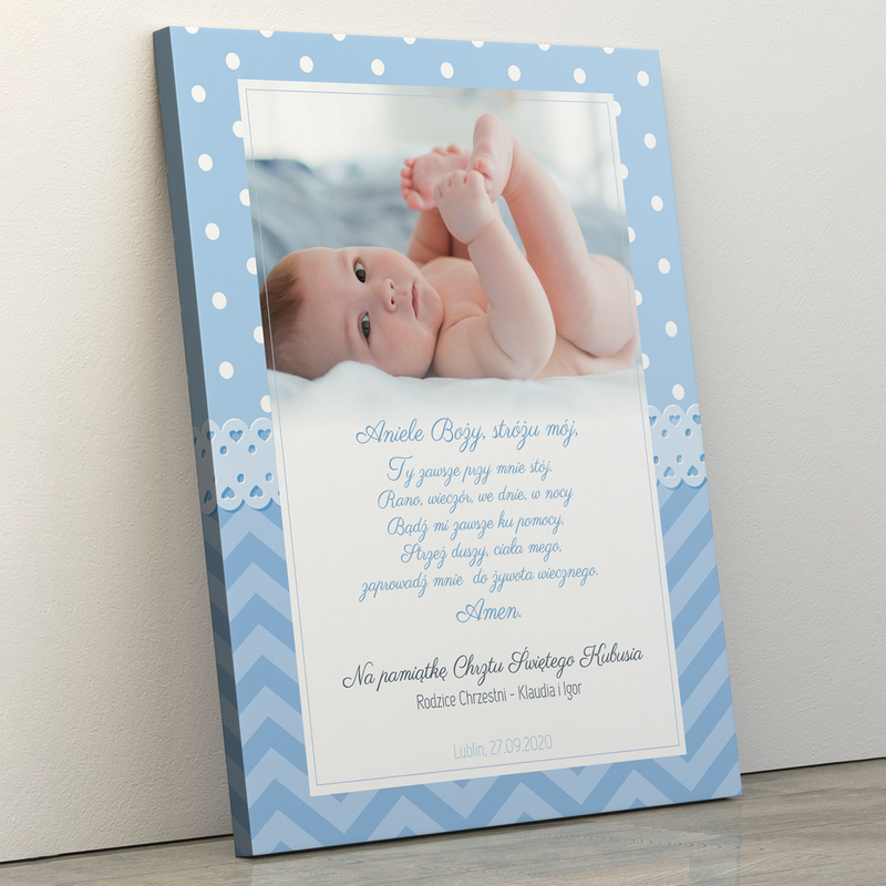 Obraz dla chłopca z niebieską ramką na chrzest 30 x 40 cm