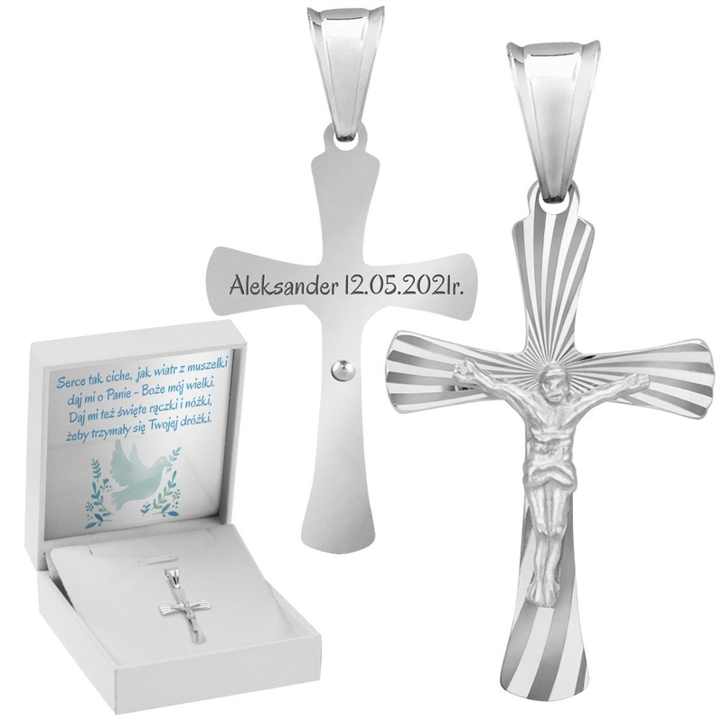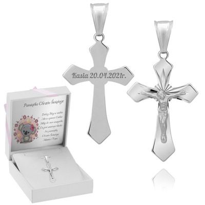 Srebrny 925 Krzyżyk z Jezusem Chrzest Komunia Bierzmowanie Grawer