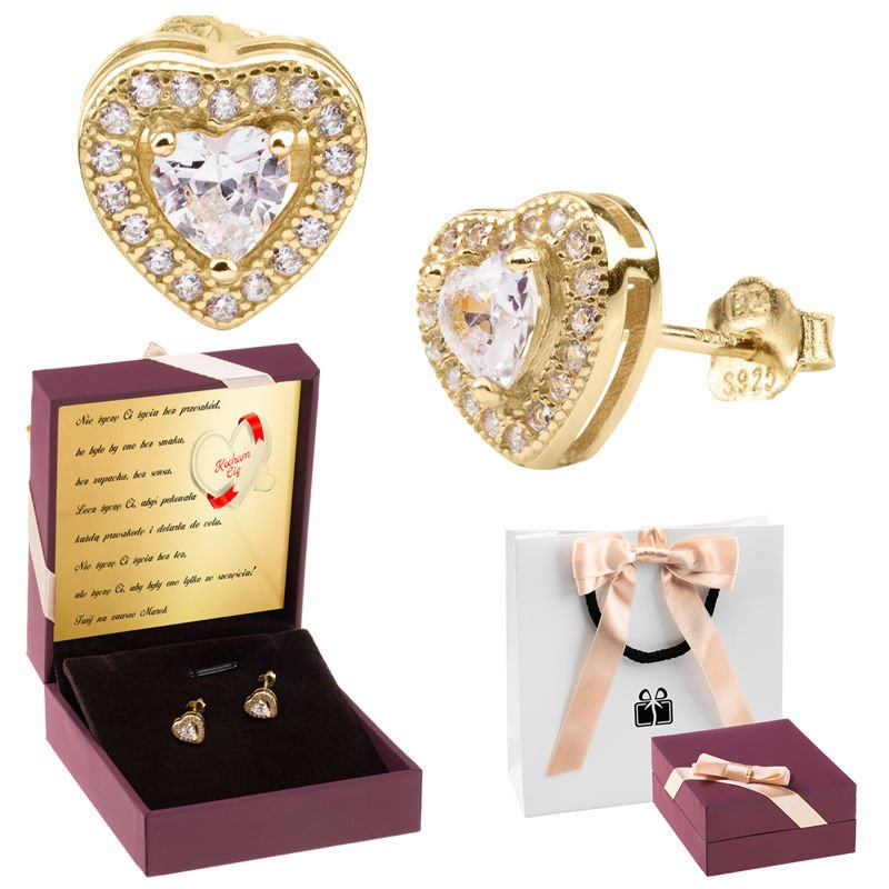 Pozłacany komplet serce z cyrkoniami 925 z dedykacją w pudełku