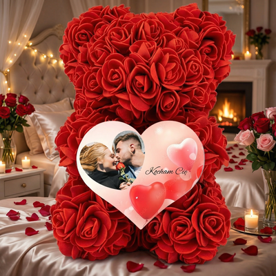 Miś z czerwonych róż ze zdjęciem i napisem „Kocham Cię” – romantyczny prezent na Walentynki