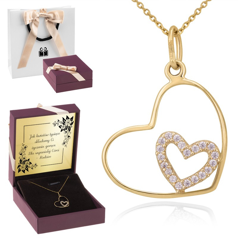 Zawieszka złote serca z cyrkoniami z łańcuszkiem i dedykacją w pudełku / prezent dla kobiety na Walentynki, rocznicę / pr. 585