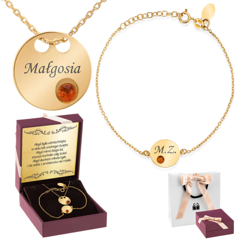 Zestaw pozłacany 925: celebrytka i bransoletka z bursztynem i grawerem