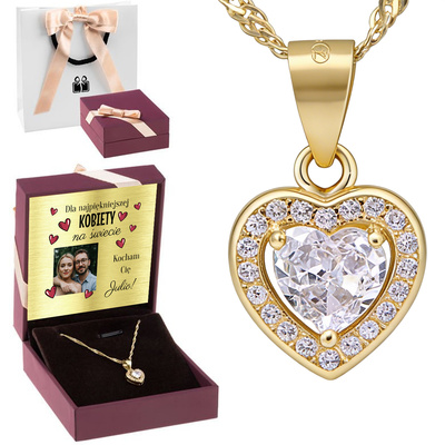 Pozłacany wisiorek serce 925 z cyrkoniami z dedykacją w pudełku