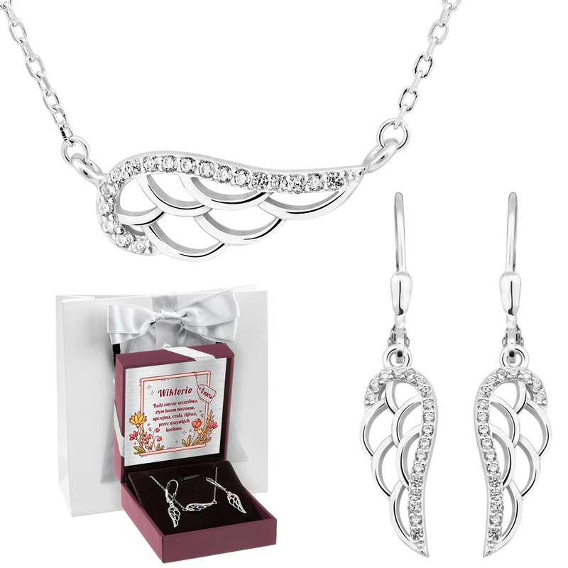 Srebrny komplet naszyjnik + kolczyki skrzydło z cyrkoniami Dedykacja