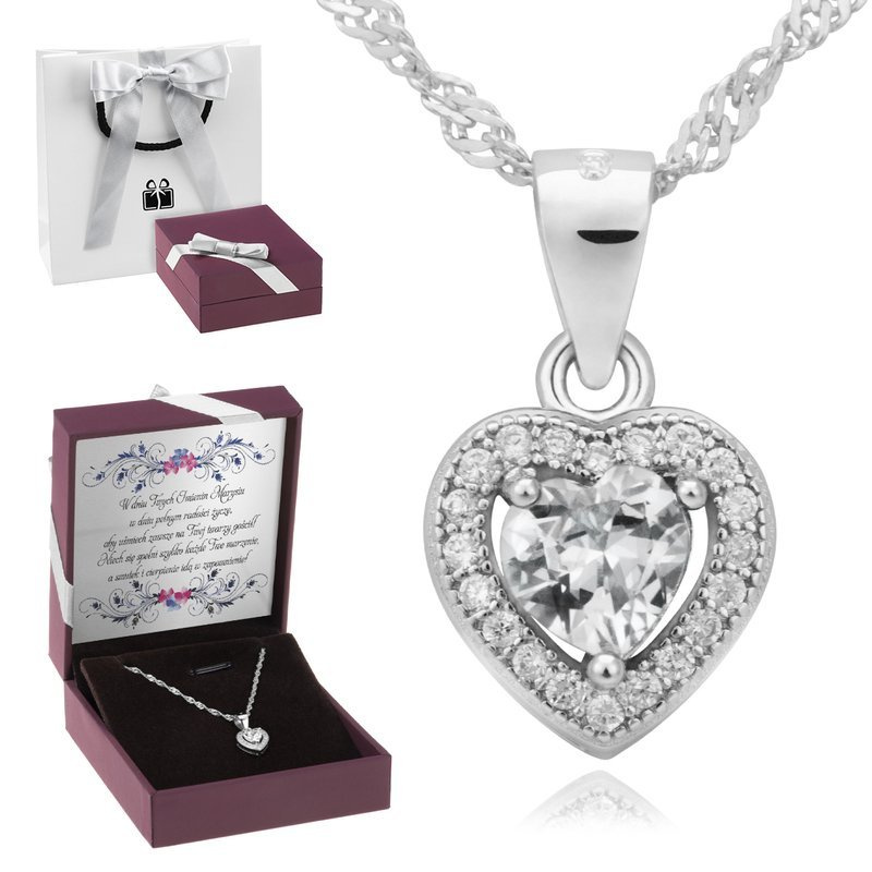 Srebrny wisiorek serce z łańcuszkiem pr 925, Białe Cyrkonie. Dedykacja