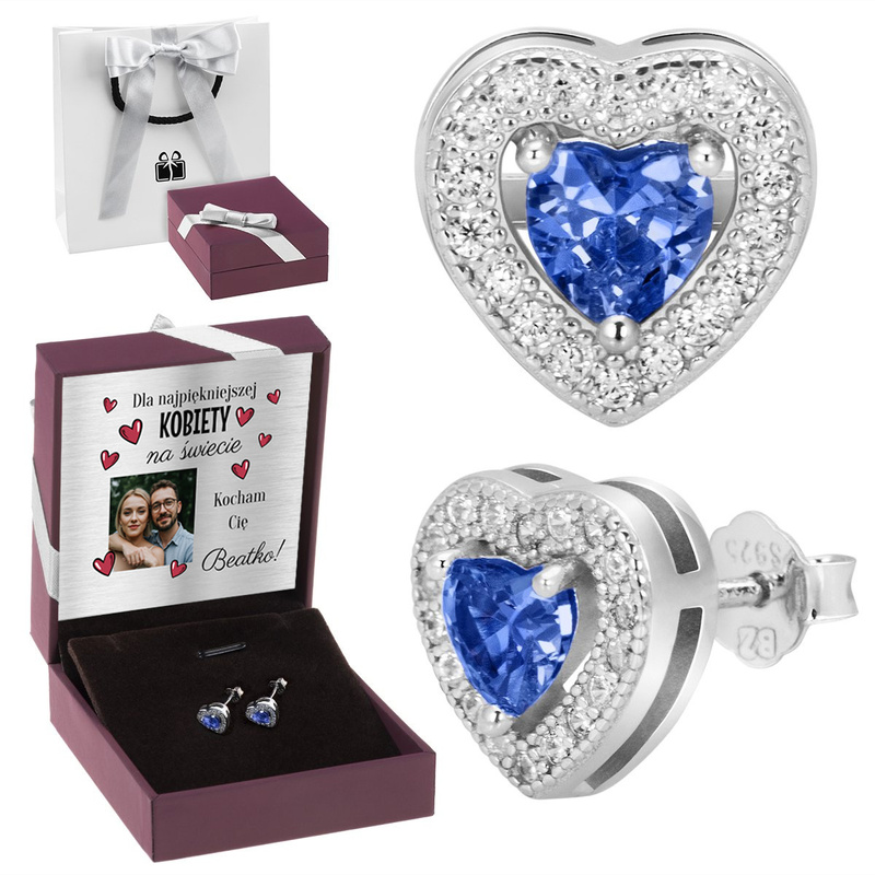Kolczyki serca srebro 925 niebieska cyrkonia z dedykacją
