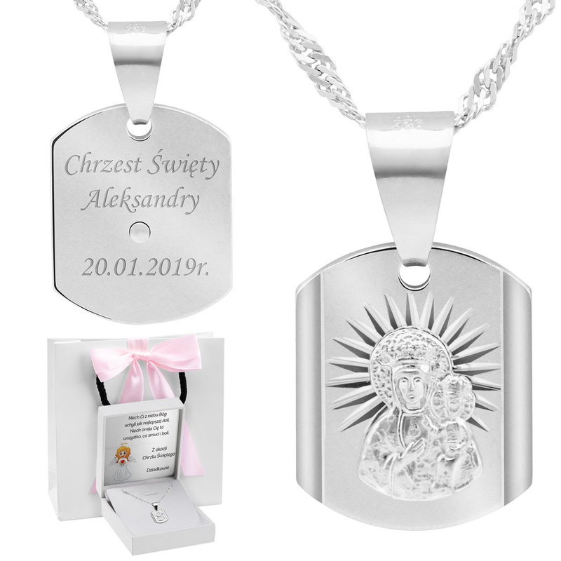 Srebrny medalik Matka Boska Częstochowska pr. 925 Grawer różowa kokardka