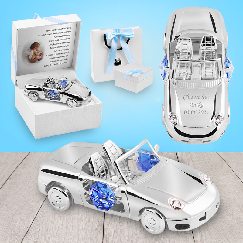 Srebrne Auto Niebieskie Kryształy pamiątka na chrzest roczek Grawer