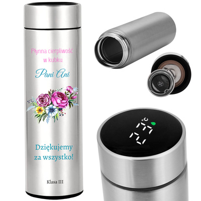 Srebrny kubek termiczny z wyświetlaczem LED – personalizowany trwałym nadrukiem UV dla nauczyciela / kwiaty