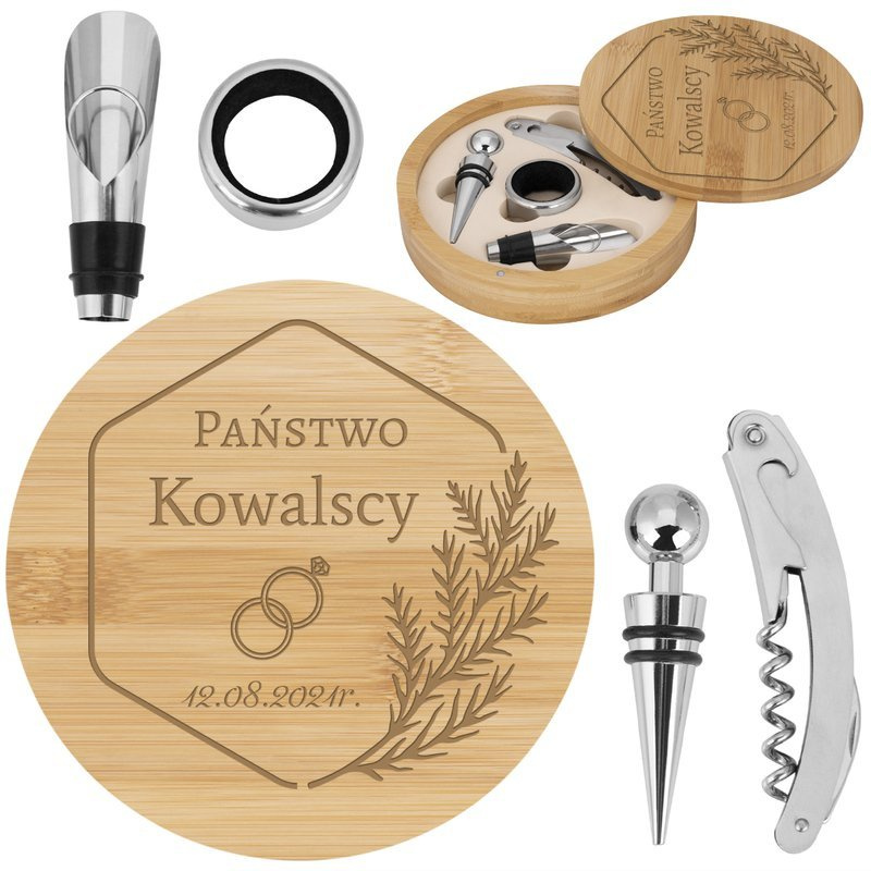 Zestaw Akcesoriów Do Wina Na Ślub Bambus Z Grawerem