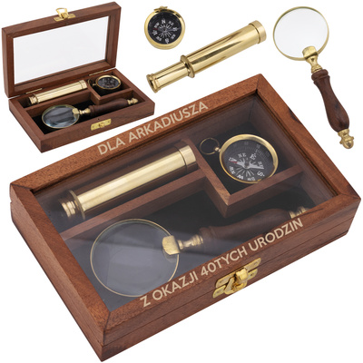 Zestaw marynistyczny: luneta, lupa i kompas – drewniane pudełko z grawerem