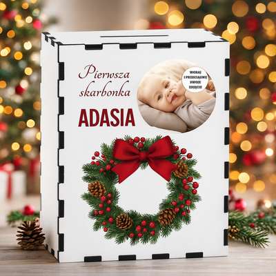 Drewniana skarbonka ze zdjęciem dziecka na roczek na chrzest / Prezent z Nadrukiem
