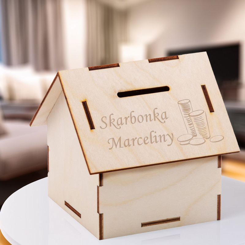 Drewniana skarbonka w kształcie domku Prezent z Grawerem