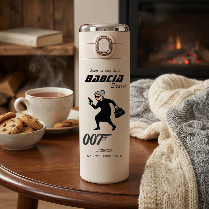 Personalizowany kubek termiczny „Babcia 007 – licencja na rozpieszczanie”