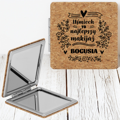 Lusterko z nadrukiem / Własny nadruk / Korkowa obudowa / Prezent na Dzień Kobiet / Lusterko kieszonkowe / Uśmiech