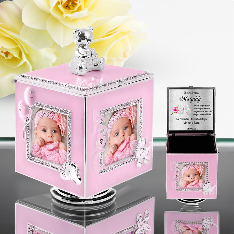 Różowa Karuzela miś z pozytywką, szkatułką i miejscem na 4 zdjęcia na chrzest roczek DEDYKACJA